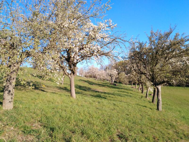 Problematisch ist nur die starke Hangneigung, die eine maschinelle Pflege des Grasbestandes unmöglich machen. Aus diesem Grund verschwinden immer mehr unserer heimatlichen Streuobstwiesen - wir sind einen anderen Weg gegangen -> Unsere Galloways